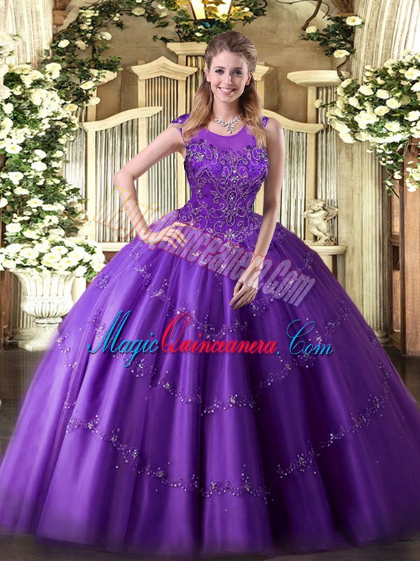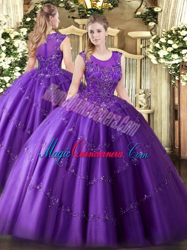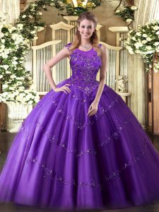 Best Selling Purple Quinceanera Gowns Military Ball and Sweet 16 and Quinceanera with Beading and Appliques Scoop Sleeveless Zipper