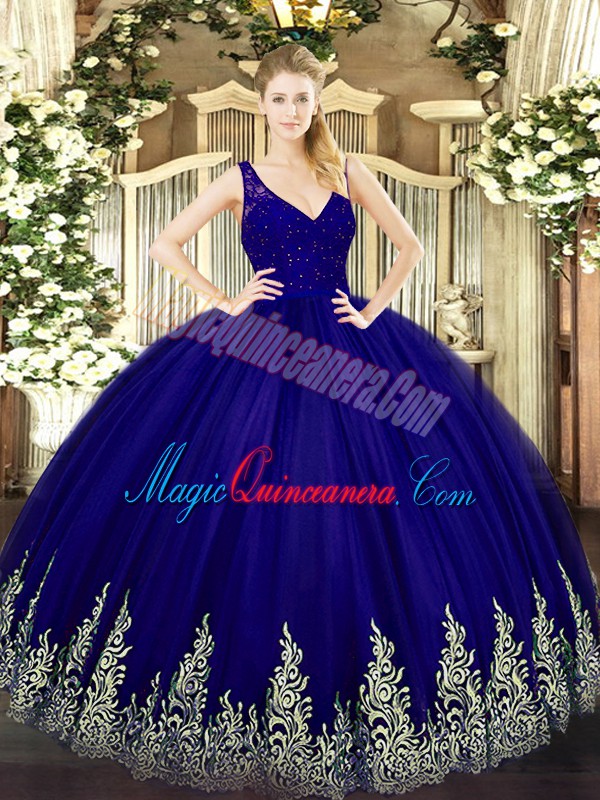 Best Selling Purple V-neck Neckline Beading and Lace and Appliques Ball Gown Prom Dress Sleeveless Backless