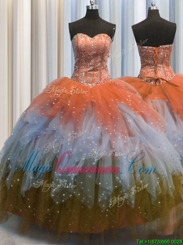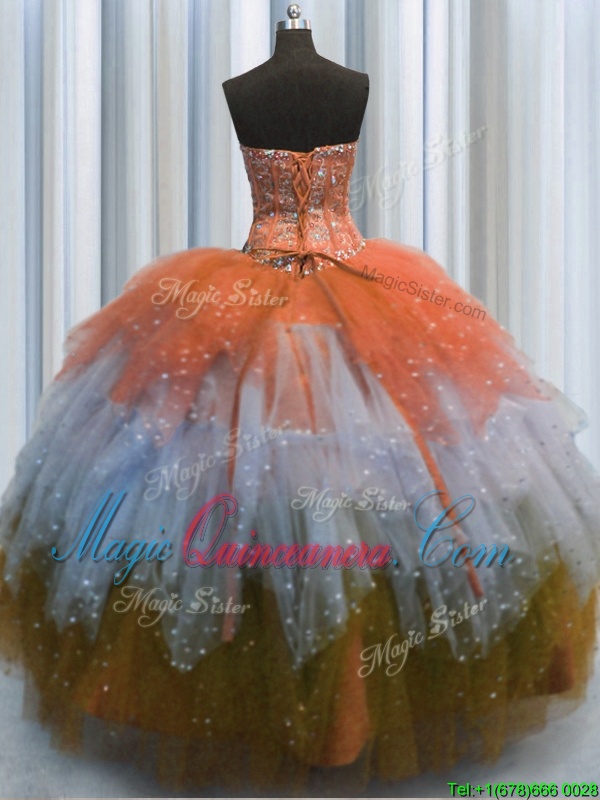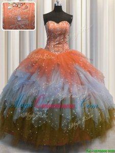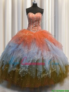 Best Selling Visible Boning Multi-color Tulle Lace Up 15 Quinceanera Dress Sleeveless Floor Length Beading and Ruffles and Sequins