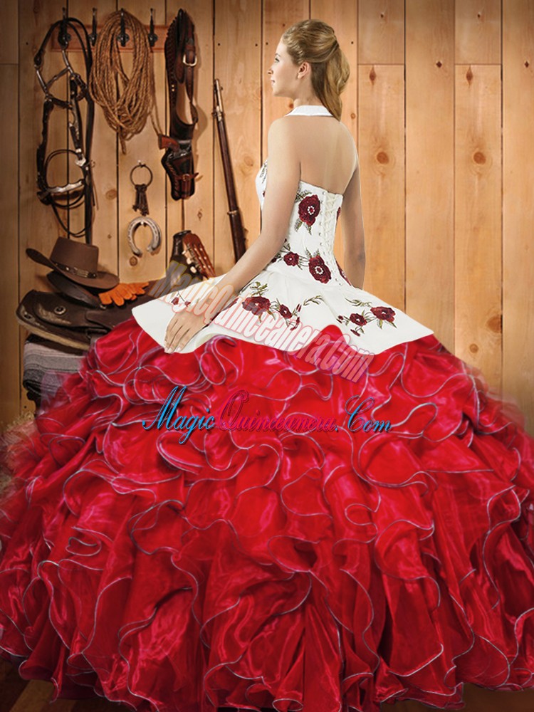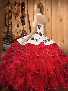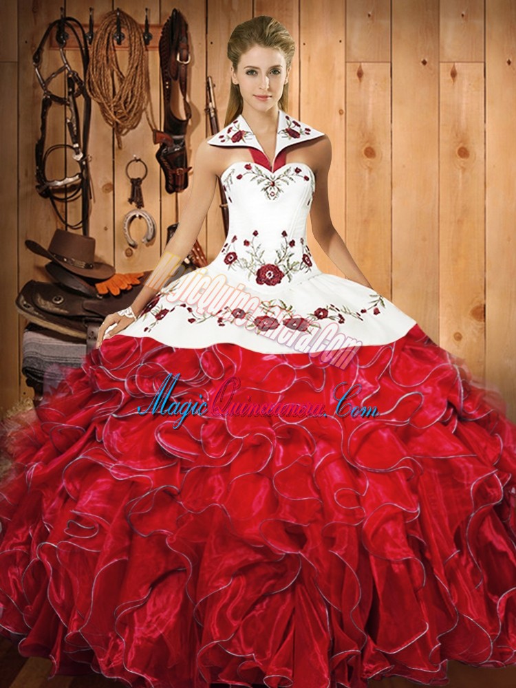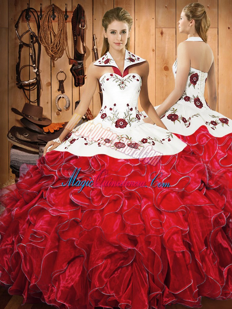 Best Selling Wine Red Ball Gowns Satin and Organza Halter Top Sleeveless Embroidery and Ruffles Floor Length Lace Up Quinceanera Gowns