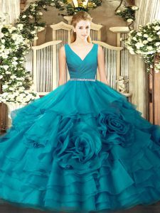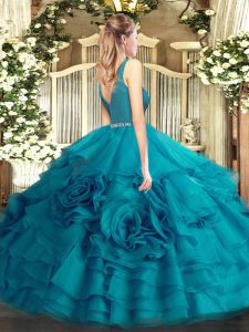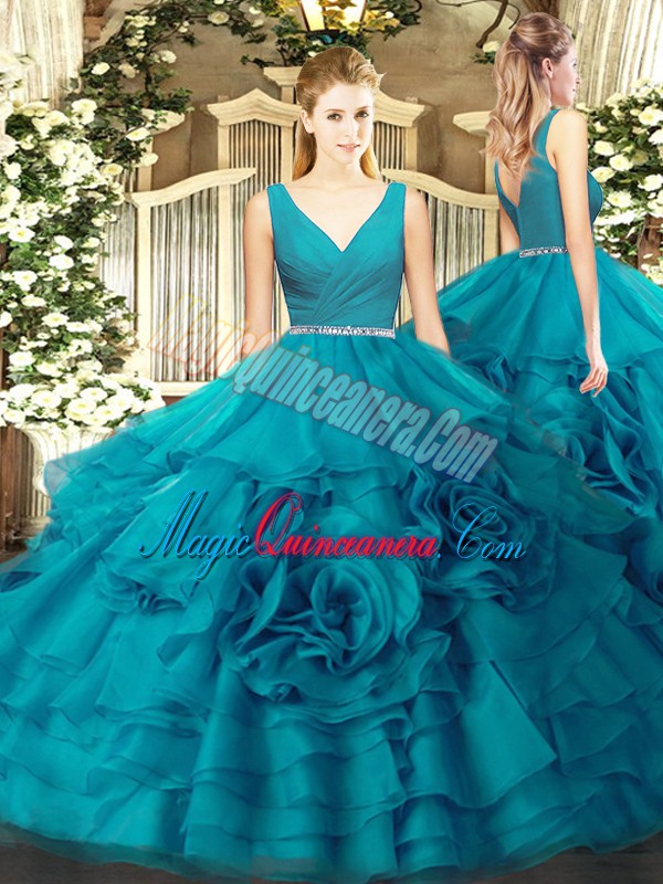 , Best Sleeveless Floor Length Beading Zipper 15th Birthday Dress with Teal