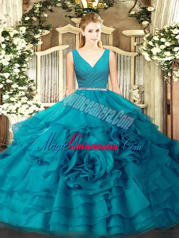 Best Sleeveless Floor Length Beading Zipper 15th Birthday Dress with Teal