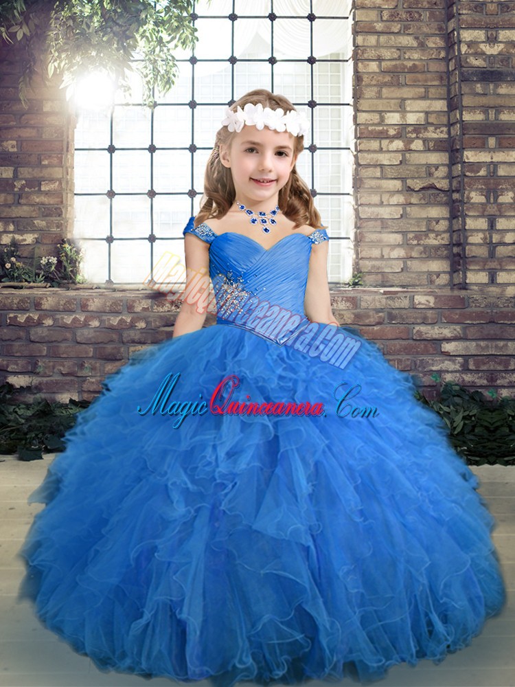 Best Straps Sleeveless Tulle Little Girl Pageant Gowns Beading and Ruffles Lace Up