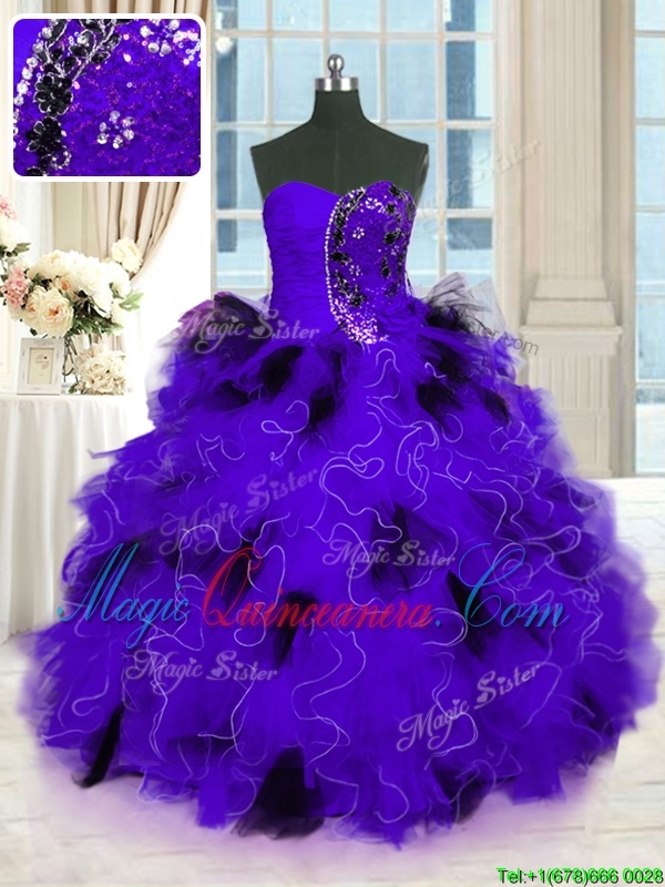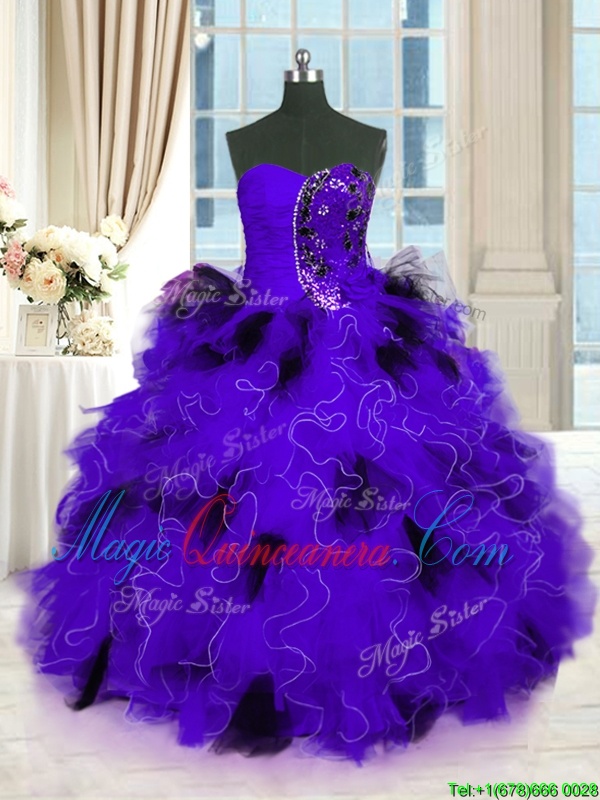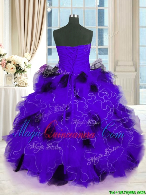 Black And Purple Tulle Lace Up Strapless Sleeveless Floor Length Quinceanera Dress Beading and Ruffles - Magic Quinceanera