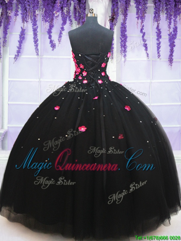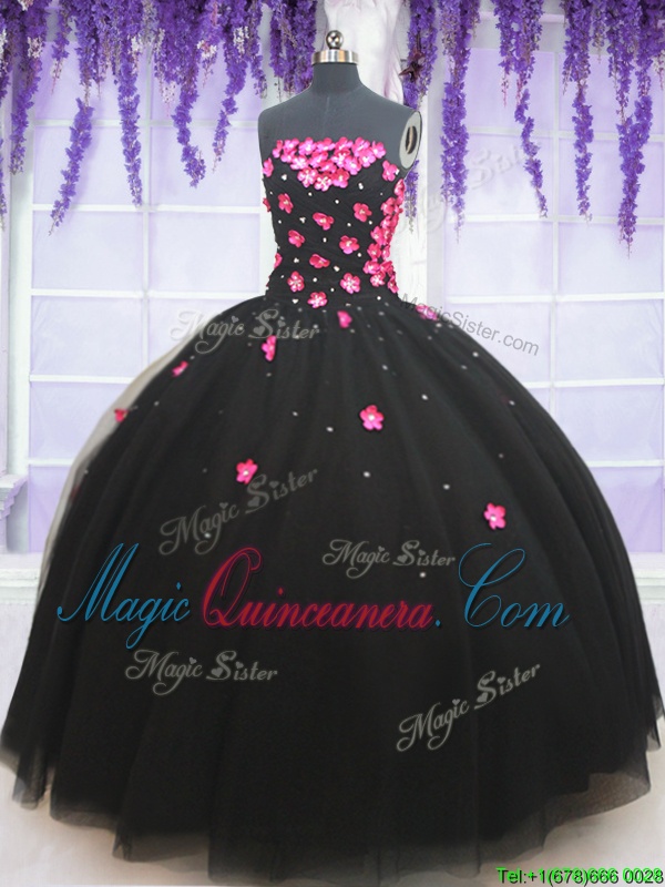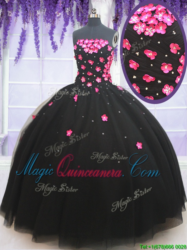 Black Ball Gowns Strapless Sleeveless Tulle Floor Length Lace Up Beading and Appliques Sweet 16 Quinceanera Dress