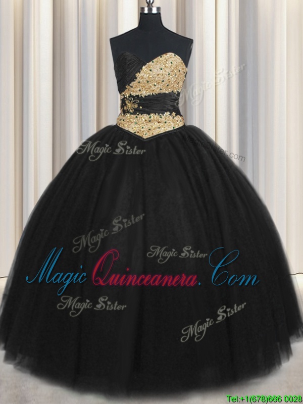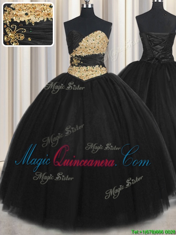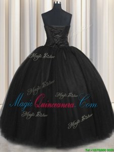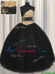 Black Tulle Lace Up Quinceanera Gown Sleeveless Floor Length Beading and Appliques and Ruching and Belt