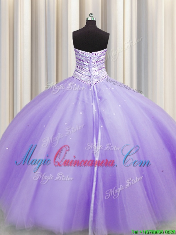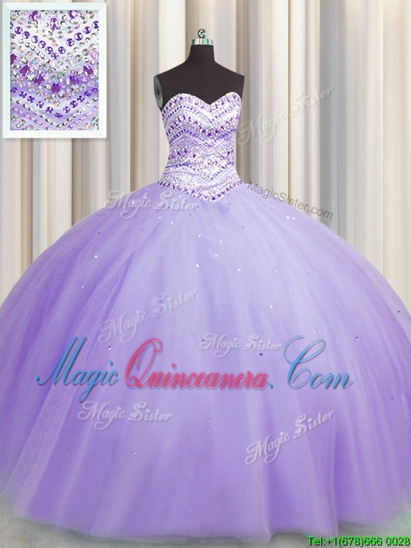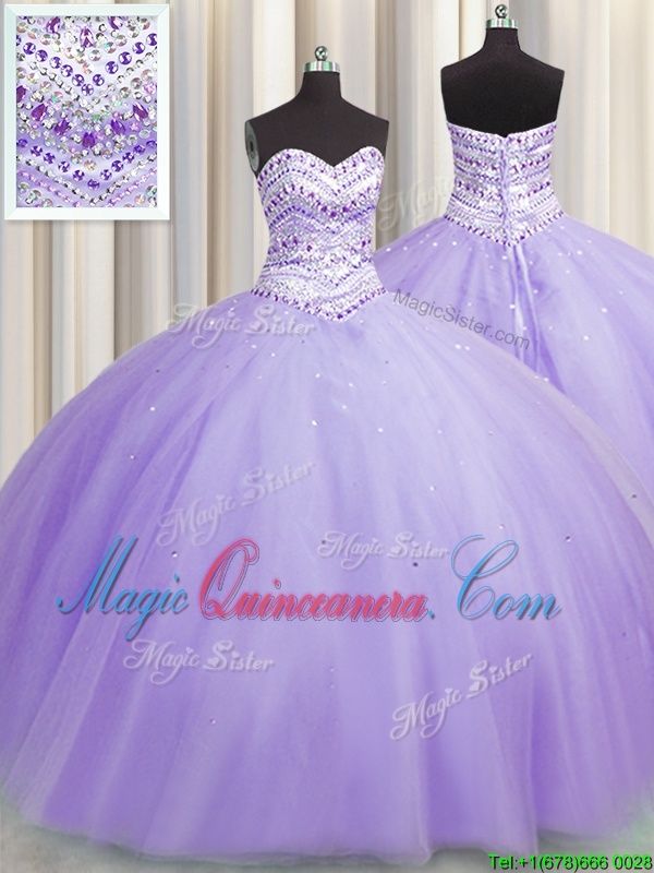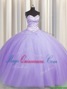 Bling-bling Puffy Skirt Lavender Tulle Lace Up 15th Birthday Dress Sleeveless Floor Length Beading