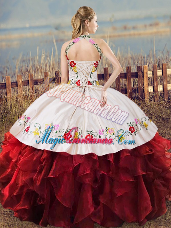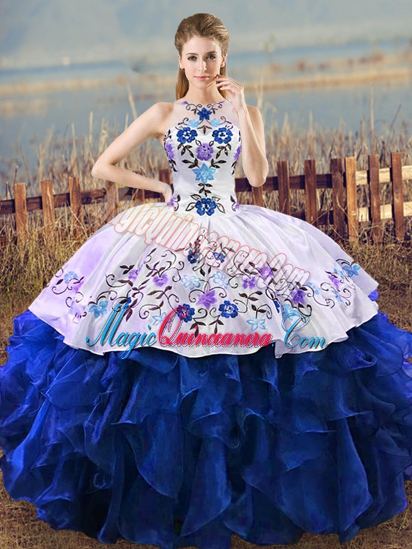 Blue And White Lace Up Halter Top Embroidery and Ruffles Quince Ball Gowns Organza Sleeveless