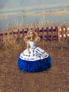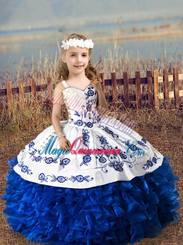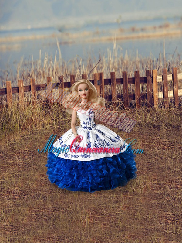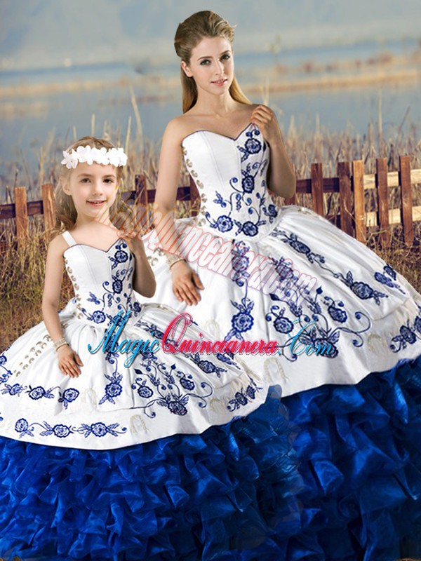 Blue And White Organza Lace Up Sweetheart Sleeveless Floor Length Quinceanera Gown Embroidery and Ruffles