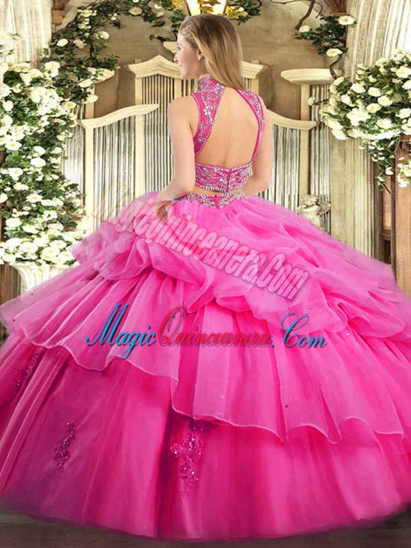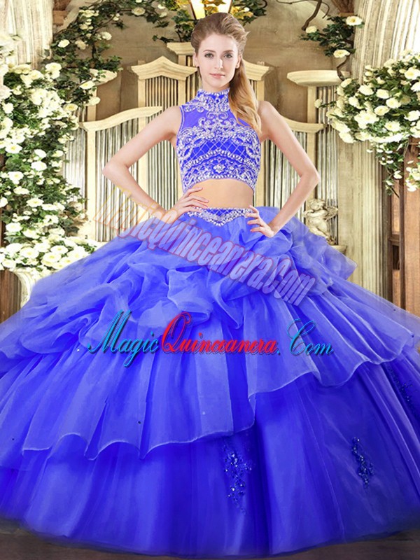 Blue Backless Quince Ball Gowns Beading and Ruffles and Pick Ups Sleeveless Floor Length