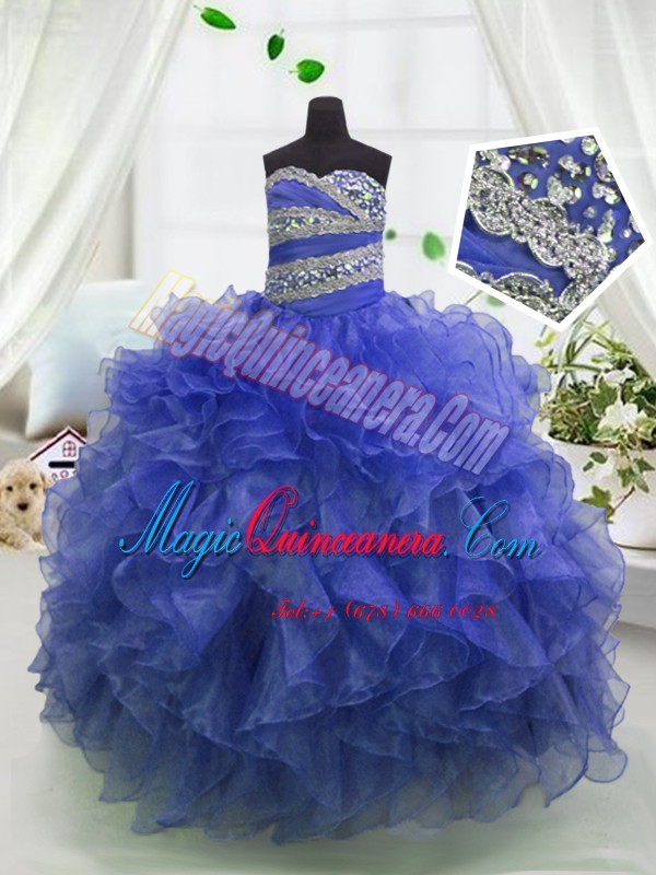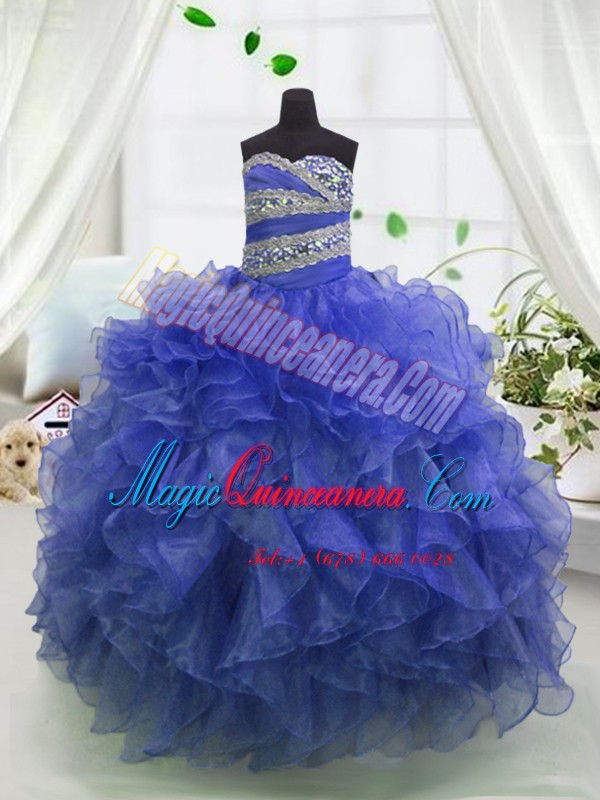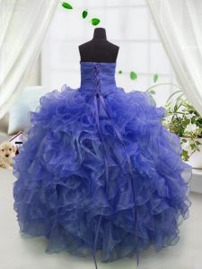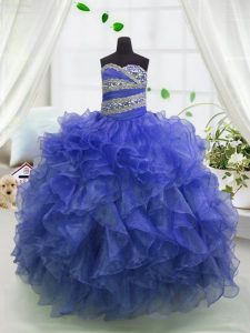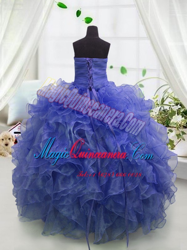 Blue Ball Gowns Beading and Ruffles Pageant Dresses Lace Up Organza Sleeveless Floor Length