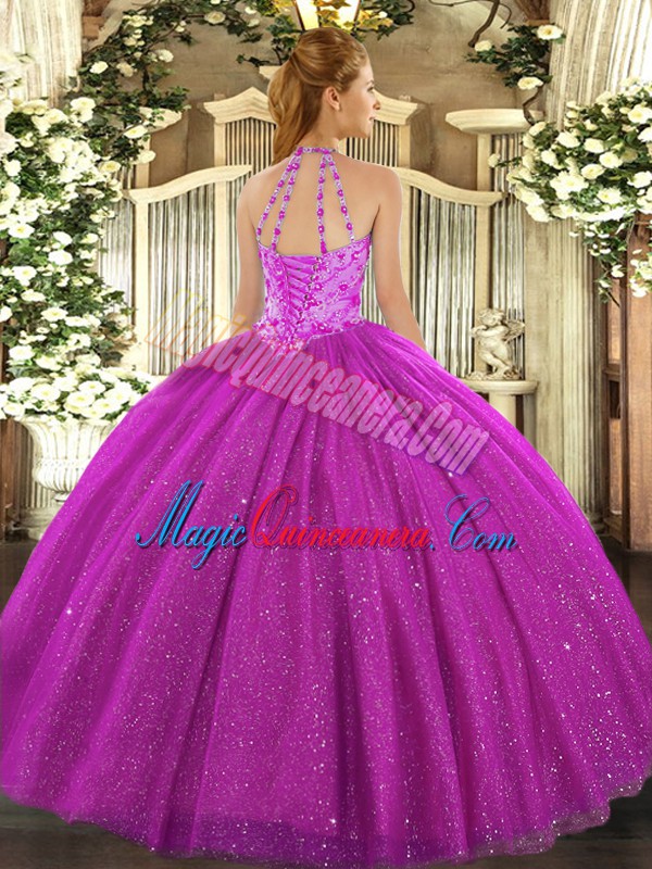 Blue Ball Gowns Halter Top Sleeveless Tulle Floor Length Lace Up Beading and Embroidery Quinceanera Gown