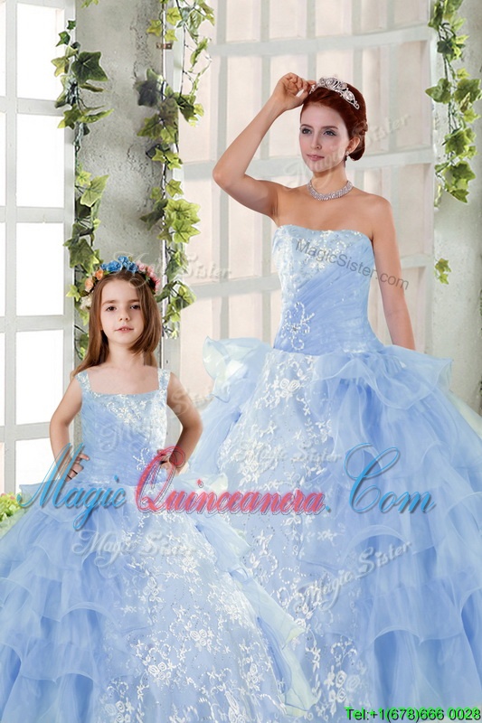 Blue Ball Gowns Strapless Sleeveless Organza Floor Length Lace Up Embroidery and Ruffled Layers Quinceanera Gown