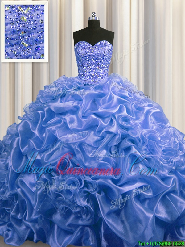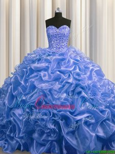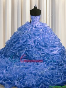 Blue Ball Gowns Sweetheart Sleeveless Organza With Train Court Train Lace Up Beading and Pick Ups Vestidos de Quinceanera