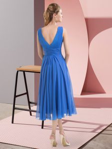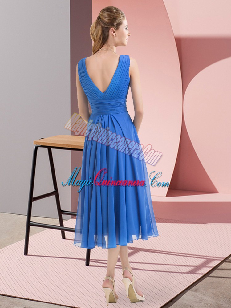 Blue Chiffon Side Zipper V-neck Sleeveless Knee Length Dama Dress for Quinceanera Beading