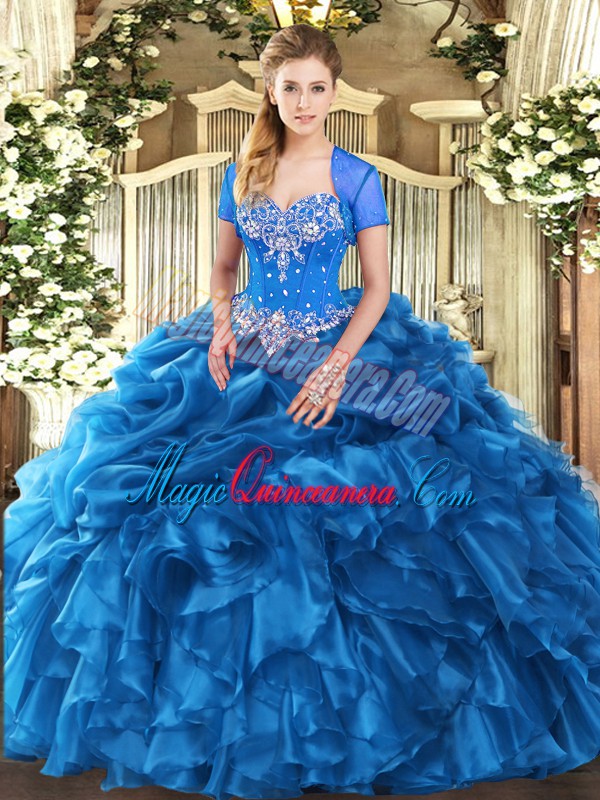 Blue Lace Up Ball Gown Prom Dress Beading and Ruffles and Pick Ups Sleeveless Floor Length