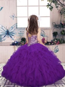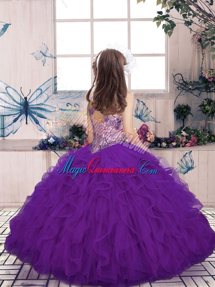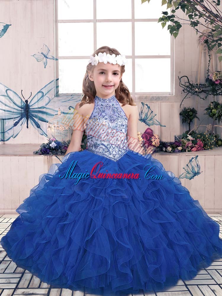 Blue Lace Up High-neck Beading and Ruffles Little Girls Pageant Gowns Tulle Sleeveless