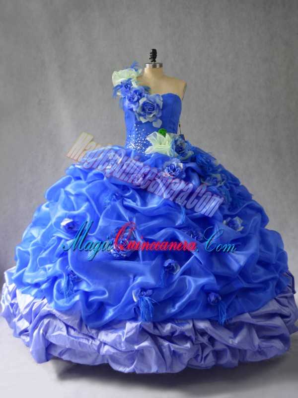 Blue Lace Up One Shoulder Pick Ups and Hand Made Flower Quinceanera Gowns Organza Sleeveless