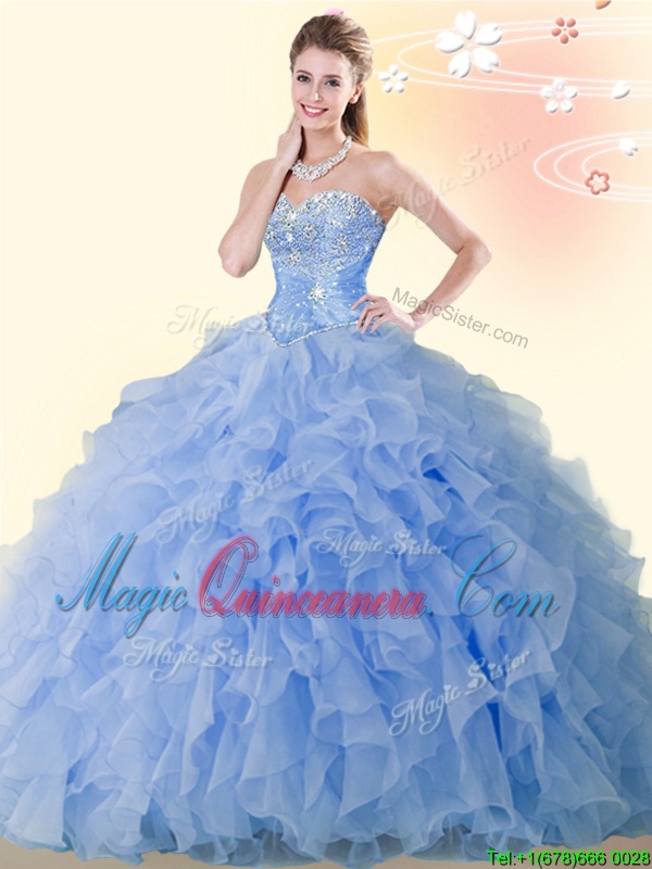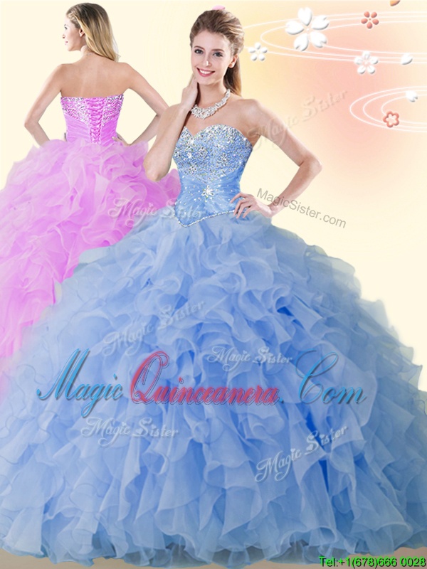 , Blue Lace Up Vestidos de Quinceanera Beading and Ruffles Sleeveless Floor Length