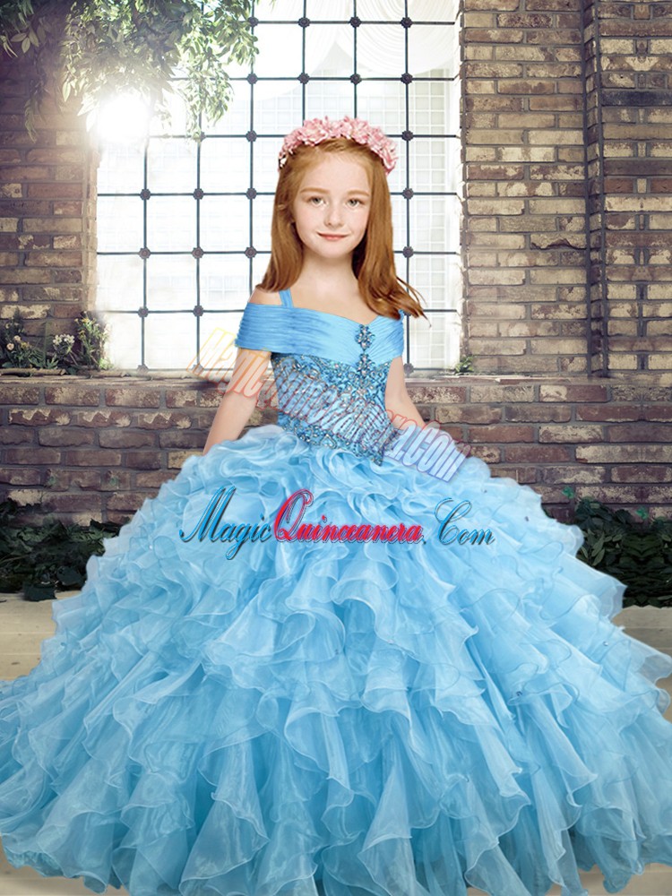Blue Organza Lace Up Straps Sleeveless Floor Length Girls Pageant Dresses Beading and Ruffles