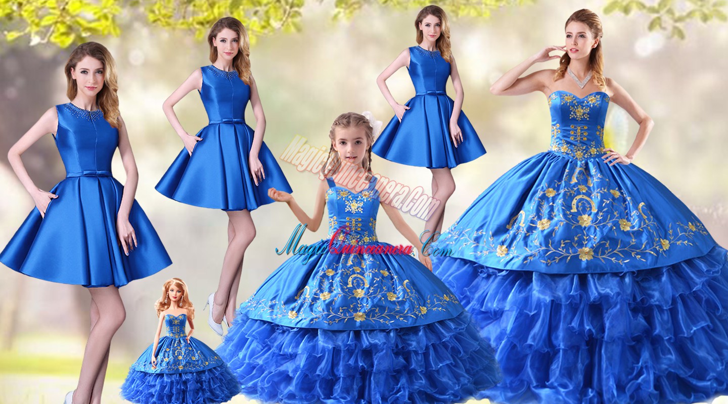 , Blue Sleeveless Embroidery and Ruffled Layers Lace Up Vestidos de Quinceanera