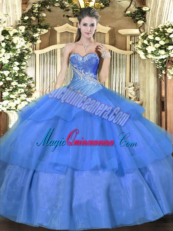 Blue Sweetheart Lace Up Beading and Ruffled Layers Sweet 16 Quinceanera Dress Sleeveless