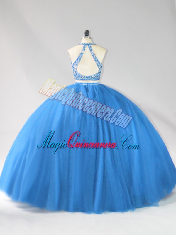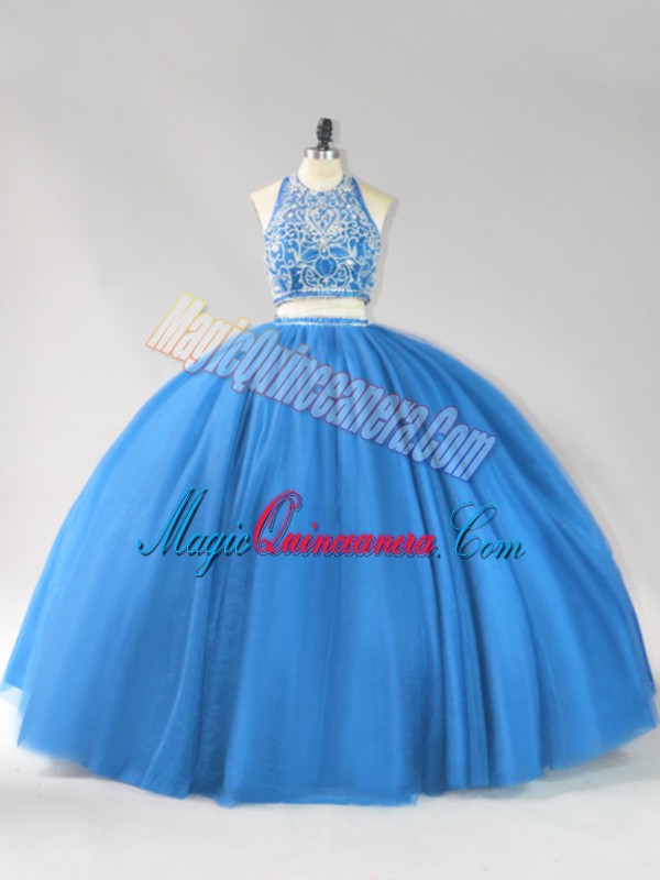 Blue Tulle Backless Strapless Sleeveless Floor Length Sweet 16 Dress Beading