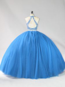 , Blue Tulle Backless Strapless Sleeveless Floor Length Sweet 16 Dress Beading
