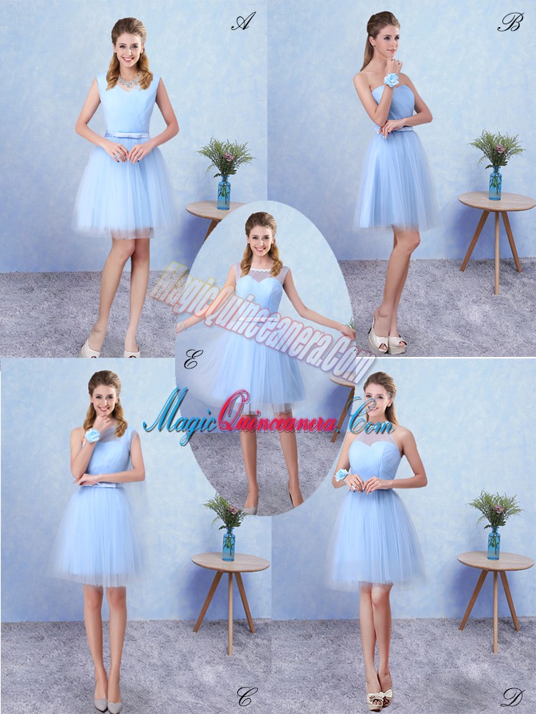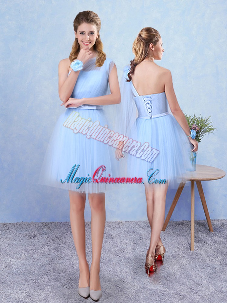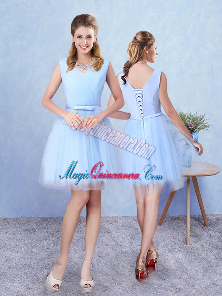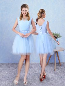 Blue Tulle Lace Up Quinceanera Dama Dress Sleeveless Knee Length Ruching