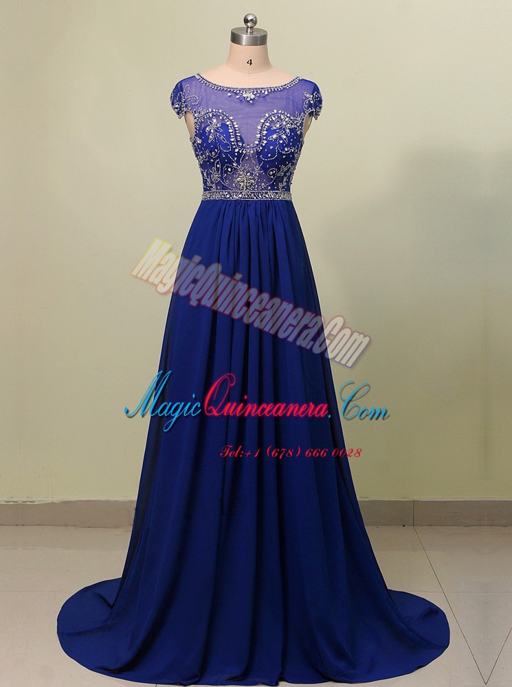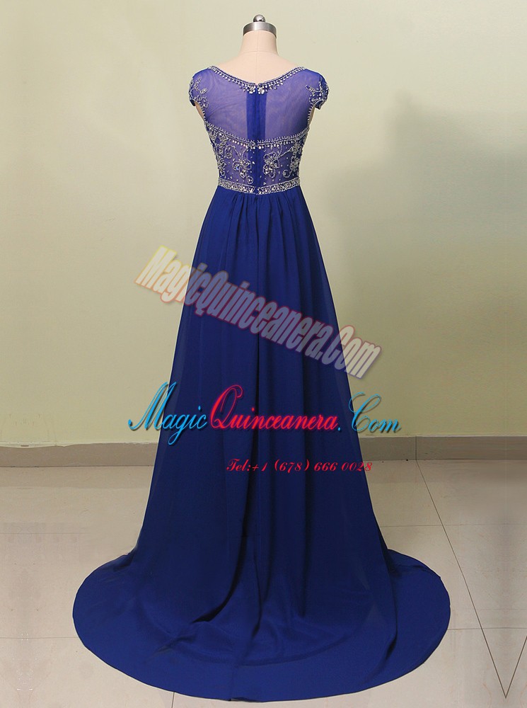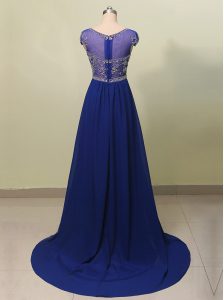 Brush Train A-line Mother Of The Bride Dress Royal Blue Scoop Chiffon Cap Sleeves With Train Zipper