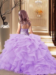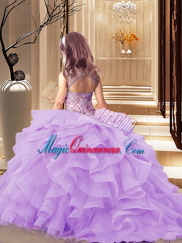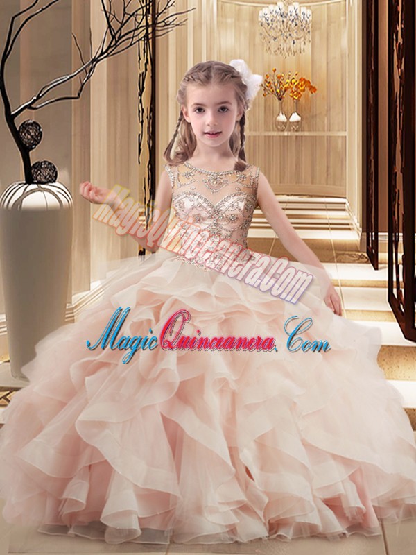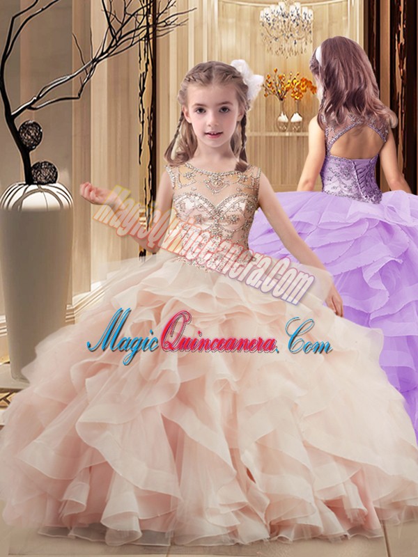 Brush Train Ball Gowns Little Girls Pageant Dress Wholesale Peach Scoop Tulle Sleeveless Lace Up