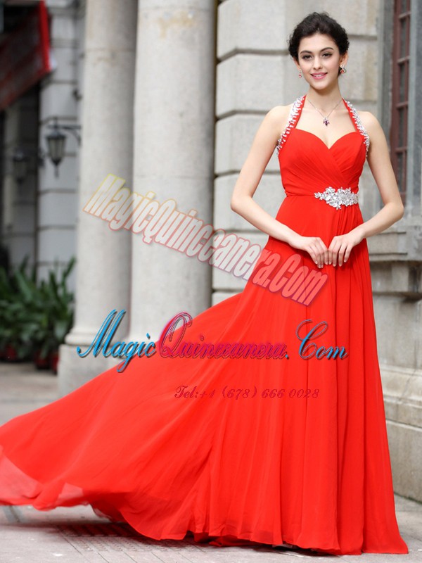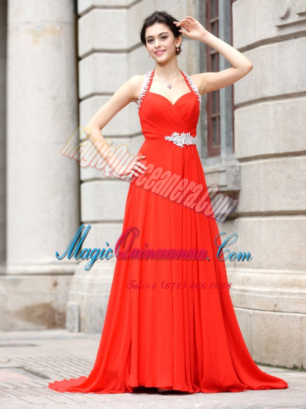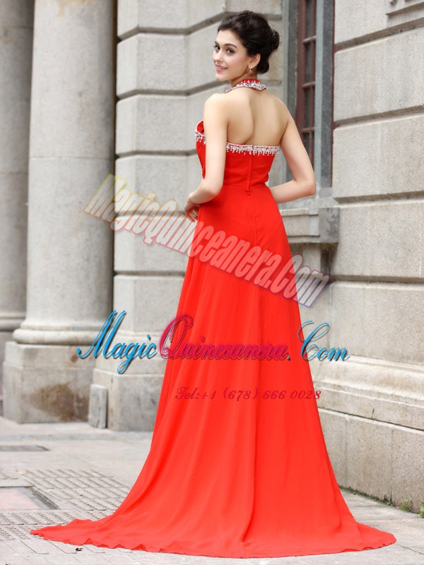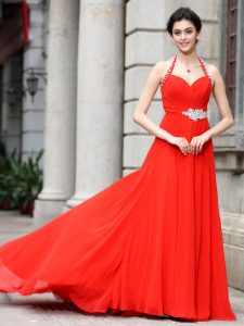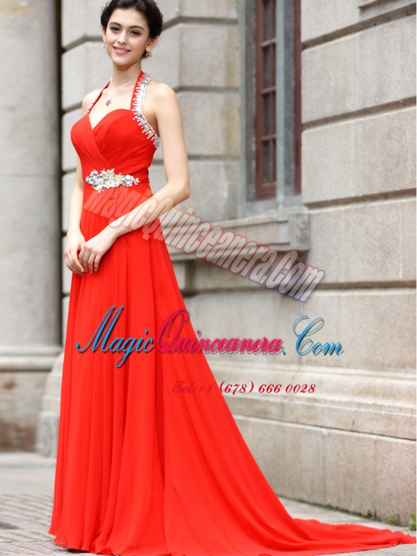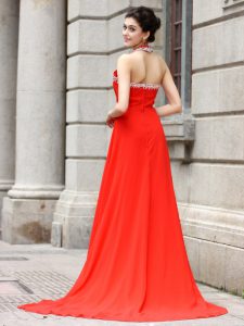 Brush Train Column/Sheath Prom Evening Gown Coral Red Spaghetti Straps Chiffon Sleeveless Zipper