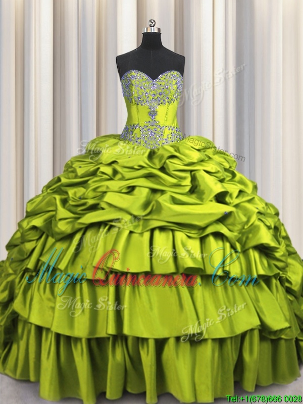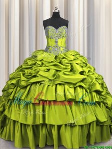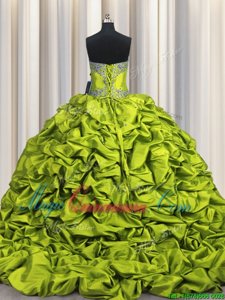 Brush Train Floor Length Yellow Green Quinceanera Dresses Taffeta Sleeveless Beading and Embroidery and Ruffled Layers and Pick Ups