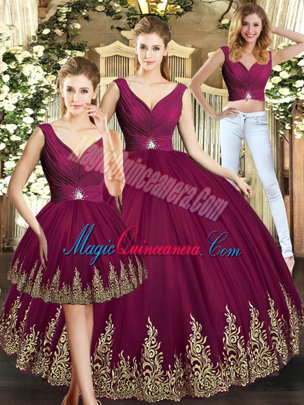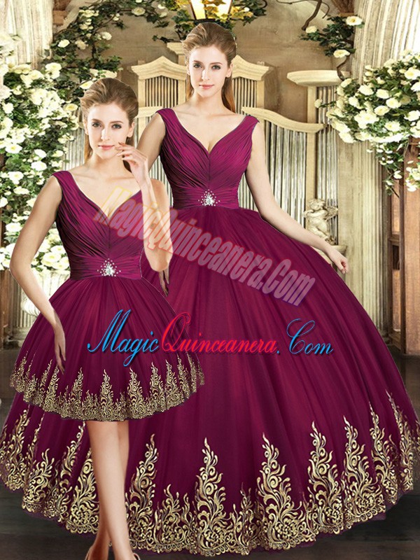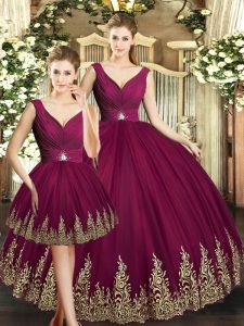 Burgundy Sleeveless Tulle Backless Quince Ball Gowns for Military Ball and Sweet 16 and Quinceanera