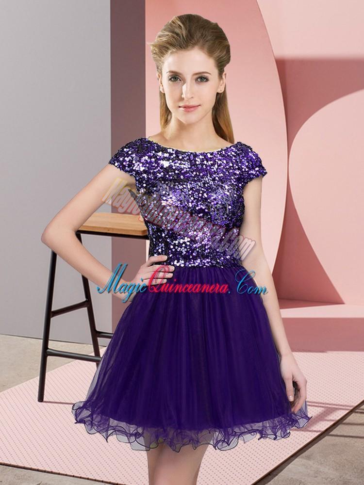 Cap Sleeves Mini Length Sequins Zipper Dama Dress for Quinceanera with Purple