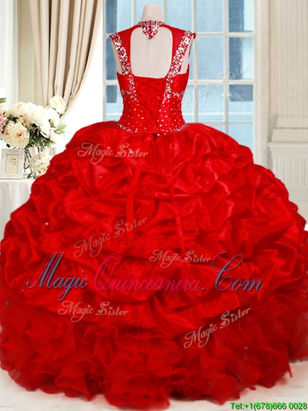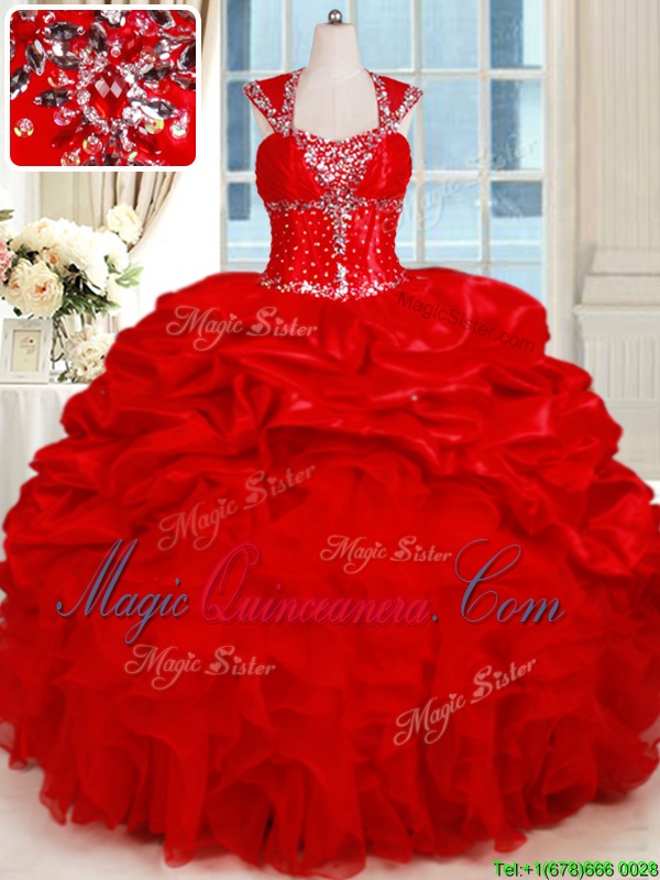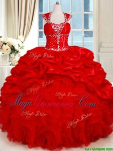 Cap Sleeves Organza and Taffeta Floor Length Backless Sweet 16 Quinceanera Dress in Red for with Ruffles and Pick Ups