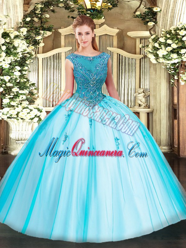 , Cap Sleeves Zipper Floor Length Beading and Appliques Quinceanera Dress