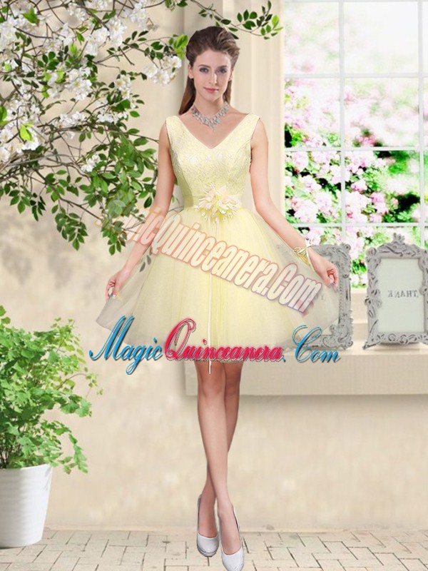 Captivating A-line Vestidos de Damas Light Yellow V-neck Tulle Sleeveless Knee Length Lace Up