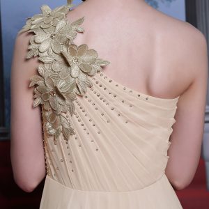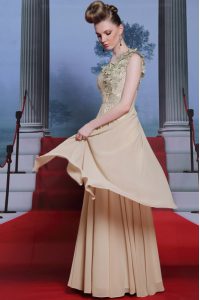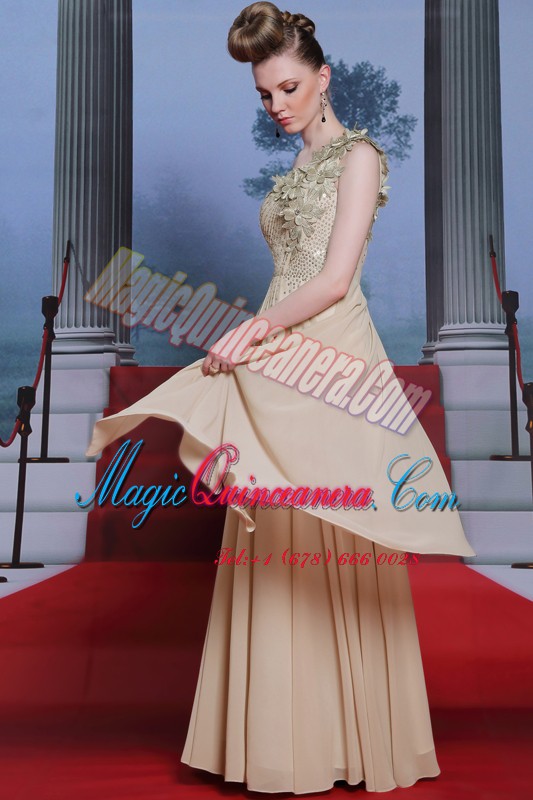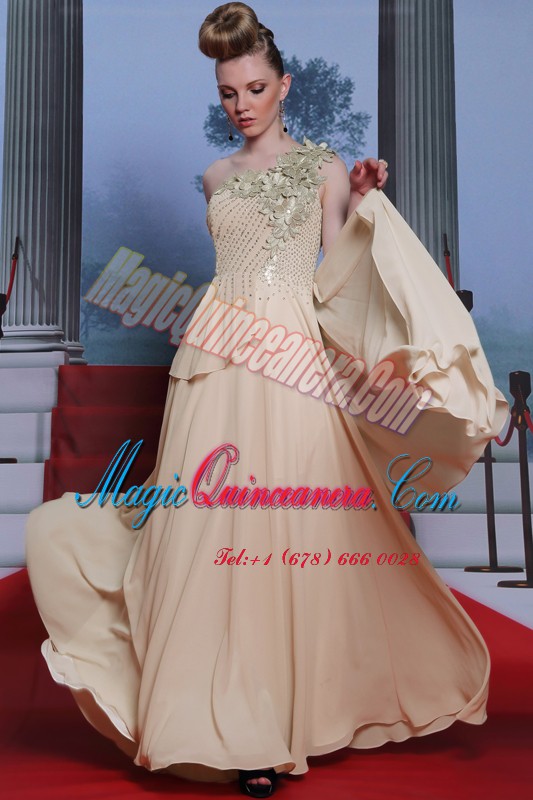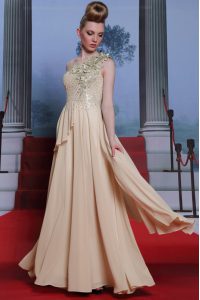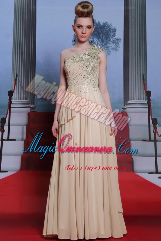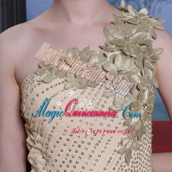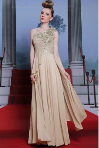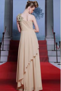 Captivating One Shoulder Appliques and Ruching Mother Of The Bride Dress Champagne Side Zipper Sleeveless Floor Length