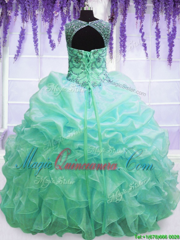 Captivating Turquoise Lace Up Scoop Beading and Pick Ups Sweet 16 Quinceanera Dress Organza Sleeveless