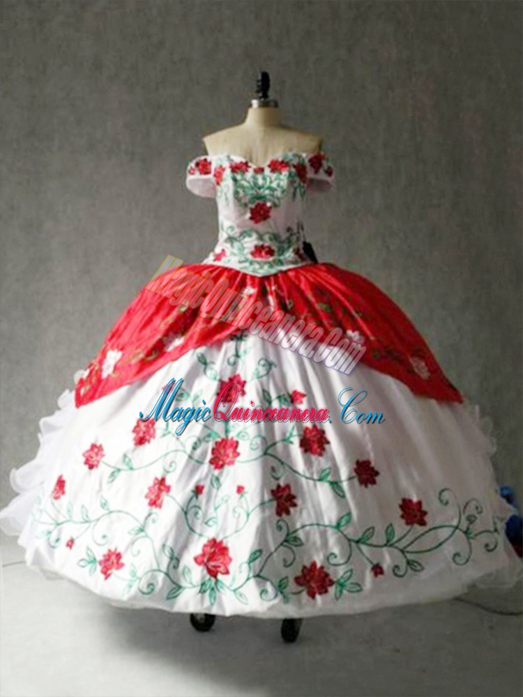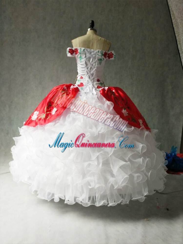 Captivating White And Red Cap Sleeves Floor Length Embroidery and Ruffles Lace Up Sweet 16 Dress - Magic Quinceanera