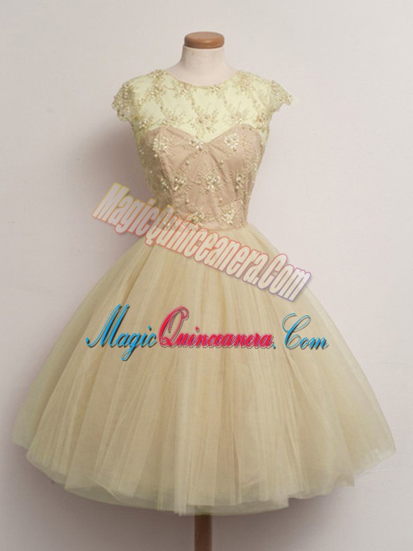 Champagne Ball Gowns Lace Court Dresses for Sweet 16 Lace Up Tulle Cap Sleeves Knee Length