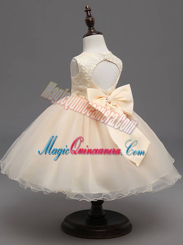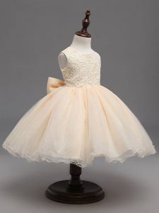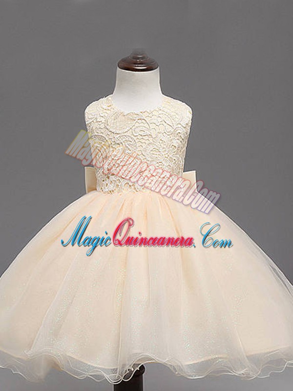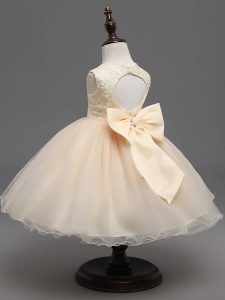 Champagne Sleeveless Knee Length Lace and Bowknot Backless High School Pageant Dress
