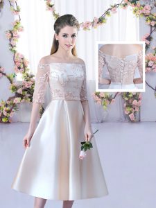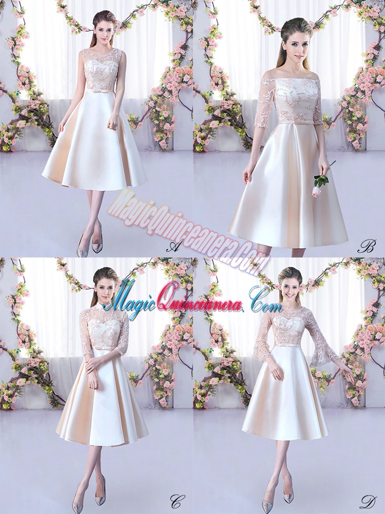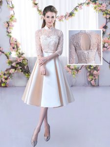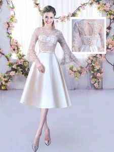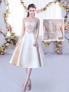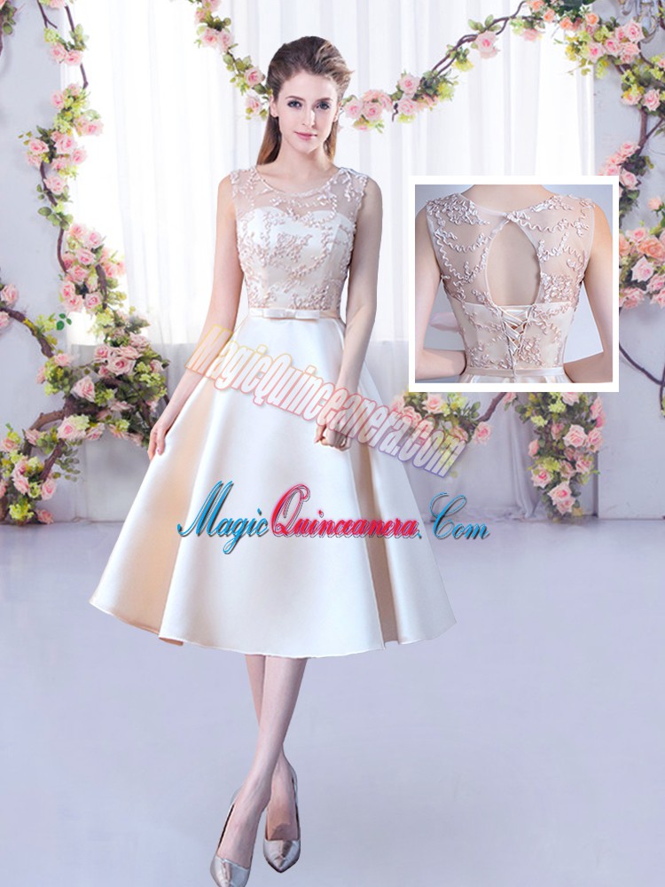 , Champagne Sleeveless Tea Length Lace and Belt Lace Up Vestidos de Damas