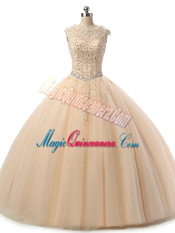Champagne Tulle Lace Up Scoop Sleeveless Floor Length Sweet 16 Dresses Beading and Lace