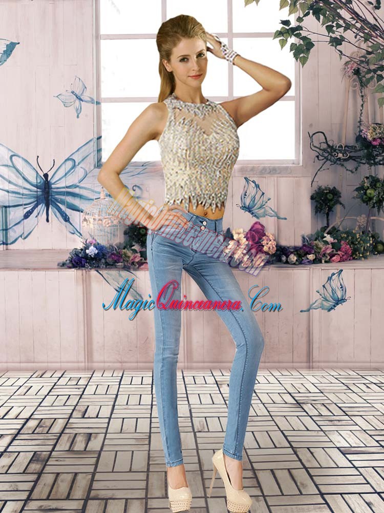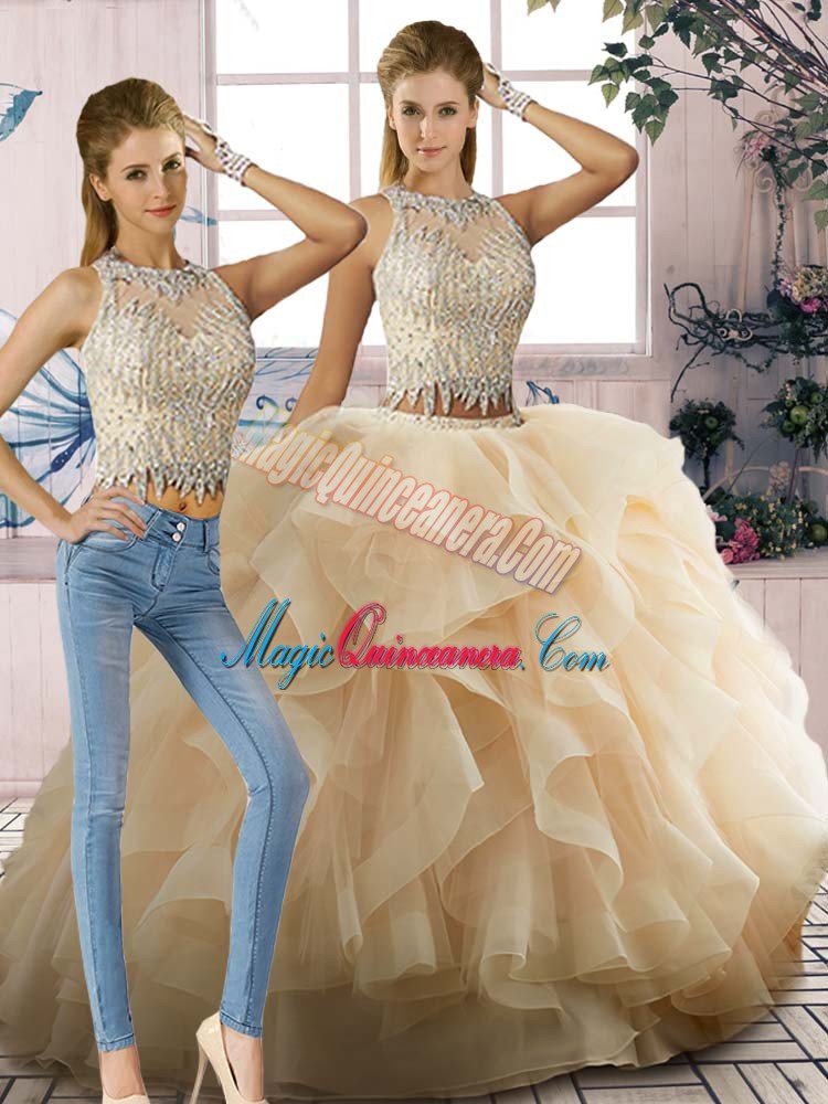 Champagne Zipper Scoop Beading and Ruffles Quinceanera Gowns Tulle Sleeveless