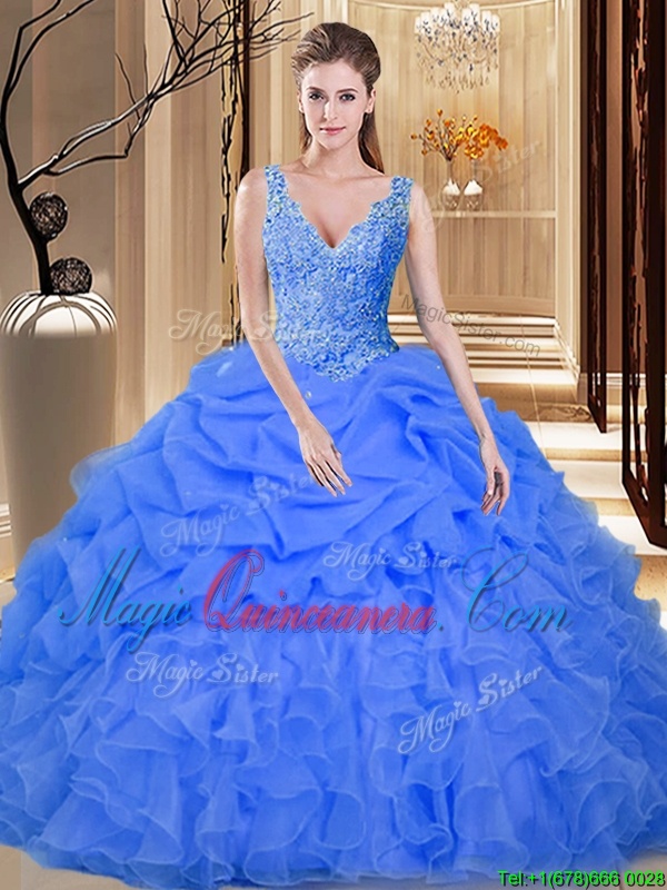Charming Blue Organza Backless V-neck Sleeveless Floor Length Sweet 16 Dress Lace and Appliques and Ruffles and Pick Ups