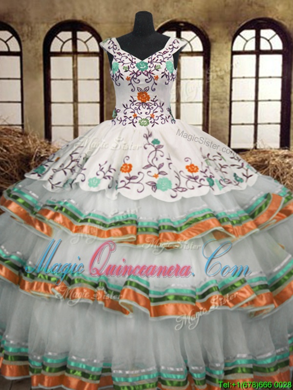 Charming Embroidery and Ruffled Layers Ball Gown Prom Dress Multi-color Lace Up Sleeveless Floor Length