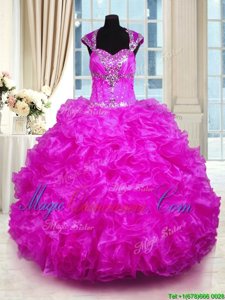 Charming Fuchsia Ball Gowns Beading and Ruffles Quince Ball Gowns Lace Up Organza Cap Sleeves Floor Length