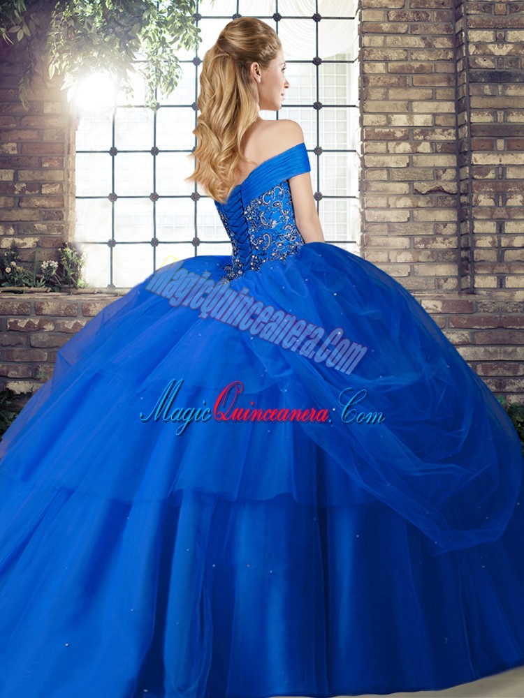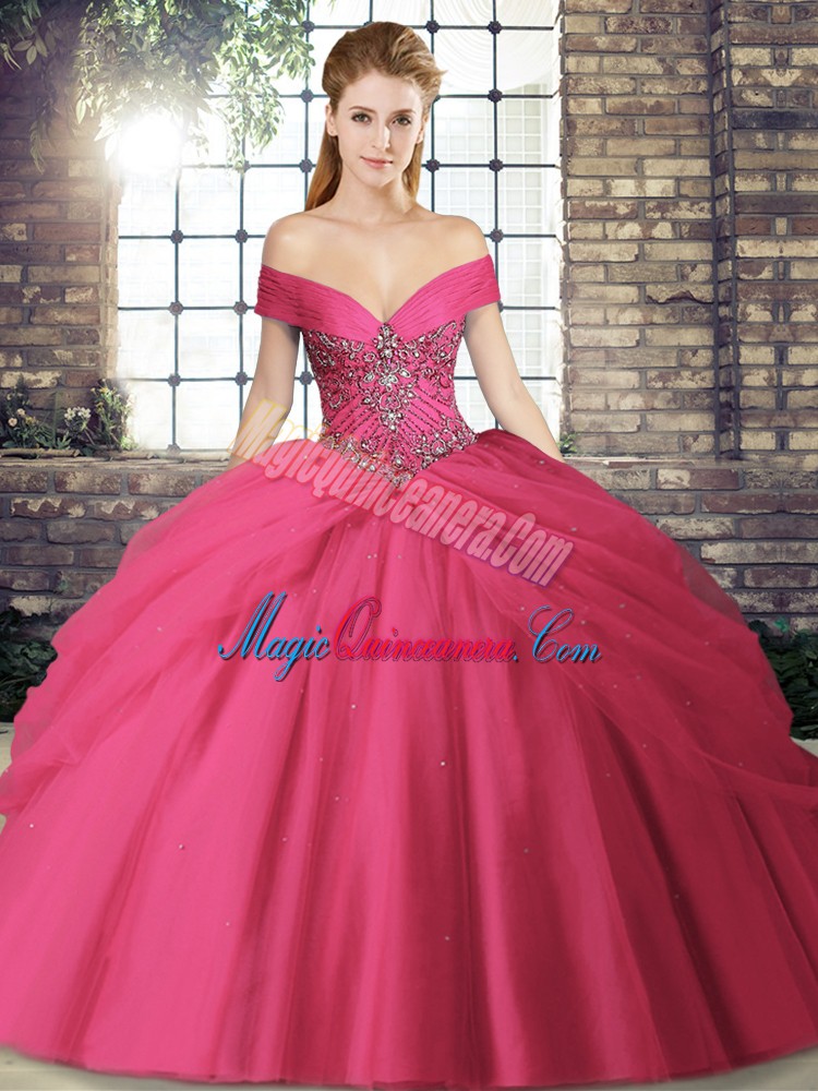 Charming Hot Pink Tulle Lace Up Quince Ball Gowns Sleeveless Brush Train Beading and Pick Ups